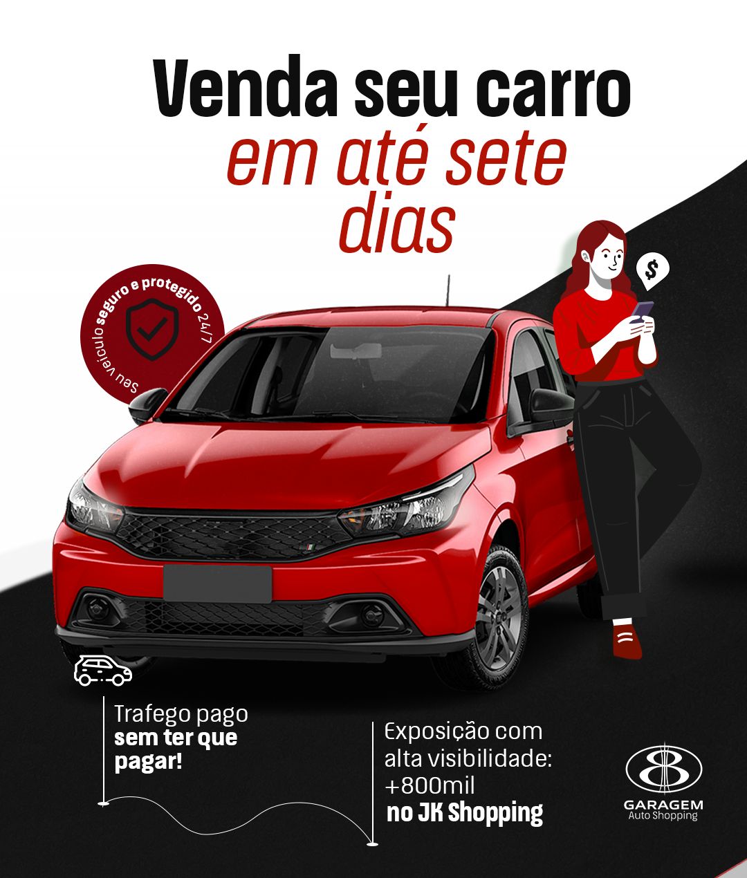 Na segunda, além dos anúncios virtuais, você deixará o seu automóvel exposto em vagas privilegiadas com alta circulação de pessoas dentro do JK Shopping sempre protegido por câmeras e vigilância 24h. Isso proporcionará uma venda mais rápida do seu veículo.